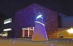 The White Koan is a modern art sculpture by Liliane Lijn which is installed outside the back entrance to the Warwick Arts Centre.[50][51] The Koan is 6 metres (20 ft) high,[50] white in colour, decorated with elliptical of fluorescent lights and is rotated by an electric motor whilst illuminated. It is intended to represent the Buddhist quest for questions without answers, the Kōan. The Koan was made in 1971 as part of the Peter Stuyvesant Foundation City Sculpture Project and was originally sited in Plymouth; it moved to the Hayward Gallery in London before being purchased by Warwick in 1972.[50]