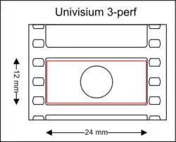 By using a negative area similar to that of the Super 35 frame (which utilizes the full width of a 35 mm film frame "perf-to-perf" as opposed to traditional 35 mm which utilizes a smaller area of the 35 mm frame offset to the right to accommodate space for an optical soundtrack) combined with 3-perf frame size (as opposed to standard 35 mm photography which uses four perforations per frame). The Univisium camera would use an aperture opening of 24mm × 12mm (.945" × .472") and three perforations per frame,[7] which would eliminate the waste associated with 2.40:1 Super 35 mm photography (wherein nearly 50% of the frame is discarded) by creating a natural 2.00:1 aspect ratio utilizing the whole film area.