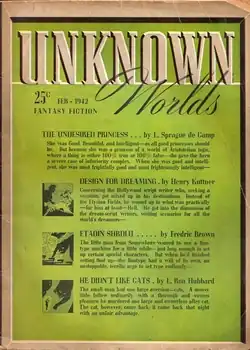 Under Campbell's editorial supervision, the fantasy element in Unknown stories had to be treated rigorously.[12] This naturally led to the appearance in Unknown of writers already comfortable with similar rigor in science fiction stories, and Campbell soon established a small group of writers as regular contributors, many of whom were also appearing in the pages of Astounding.[12] L. Ron Hubbard, Theodore Sturgeon, and L. Sprague de Camp were among the most prolific.[9][12] Hubbard contributed eight lead novels including Typewriter in the Sky, Slaves of Sleep, and Fear, described by Ashley as a "classic psychological thriller";[12] SF historian and critic Thomas Clareson describes all eight as "outstanding".[9] De Camp, in collaboration with Fletcher Pratt, contributed three stories featuring Harold Shea, who finds himself in a world where magic operates by rigorous rules.[9][14] The title of one of these, "The Mathematics of Magic", is, according to SF critic John Clute, "perfectly expressive of the terms under which magic found easy mention in Unknown".[15]