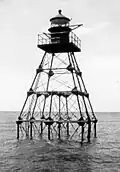 The unmanned reef lights were intended to mark local hazards and did not need to be visible for as far as the reef lights that were erected near the Keys during the 19th century.[a] By the time the lights in this list were erected, older lighthouses were being automated, and these new lights were designed to be automated from the start. The lights resembled the older reef lights in having a wrought iron skeletal pyramidal structure on a screw-pile foundation. They all originally had lanterns on their peaks, so that they looked like smaller versions of the older reef lights, but had no keeper's quarters.[2][3]