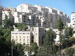 Situated along the northern edge of the mountain plateau on which central Jerusalem lies, Unsdorf is one of a series of Haredi neighborhoods extending in a continuous line from the western entrance of Jerusalem to Jaffa Gate.[3] Unsdorf is bordered by Kiryat Sanz to the east, Kiryat Belz to the south, and Kiryat Itri to the southwest. The main thoroughfare is Sorotzkin Street, named after Rabbi Zalman Sorotzkin.[4][5] A small side street off Sorotzkin is Rechov Menachem Meishiv, named after the Torah work by Rabbi Menachem Sofer, a rabbinical leader in pre-war Romania and who was murdered in the Holocaust.[6]