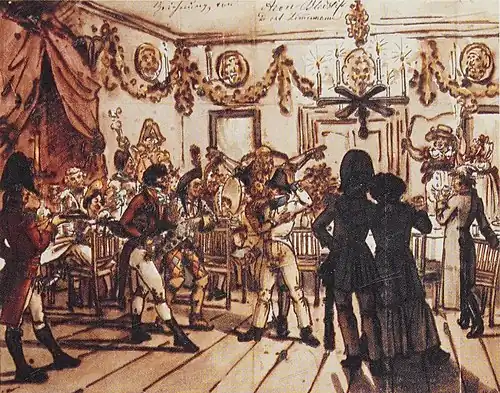 The festivities, or already the preparations for them, were announced in the booklets. In order to depict these "thrusting" days - as it is formulated in the description of the first feast - for posterity, the members produced the illustrated feast acts, which are now kept in the Historical Museum in Vienna. A third (smaller) celebration was the name day of the "Generalquartiermeisterin" (Therese Fellner) on Theresientag (15 October) 1818. On this occasion a poem, a drama, a picture and several smaller contributions - almost the entire booklet - were dedicated to her. On 3 December 1818, plans were already being made for the next upcoming New Year's Eve celebration. Because the last issues are lost, it is not known whether this actually took place.[11]