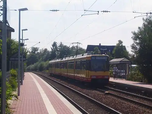 Untergrombach station is a "halt" (Haltepunkt) in the Bruchsal district of Untergrombach in the German state of Baden-Württemberg. It is located on the Rhine Valley Railway between Heidelberg and Karlsruhe and is served by lines S31 and S32 of the Karlsruhe Stadtbahn. In the peak hour several services on line S3 of the Rhine-Neckar S-Bahn stop in Untergrombach.