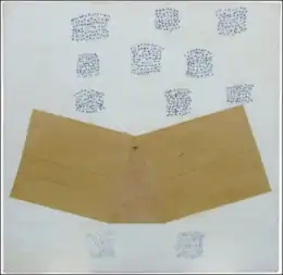 According to Gallagher, this mixed media artwork represents a minstrel show. It comprises a collection of pieces of paper adhered to a canvas like a collage, including two pieces of penmanship paper in the middle. Groups of eyes and red lips are lightly painted onto the pieces of paper. The viewer must get close to the artwork to see the faint lips and eyes.[1]