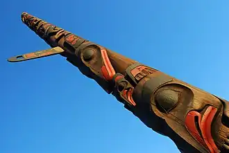 Oliver and Bender designed the 50-foot (15 m) totem based on Haida imagery, and Bender carved the sculpture.[2] The top of the totem depicts a raven holding a Salish spinning whorl. Below the raven are human figures, a killer whale with a protruding dorsal fin, another smaller raven, and a bear holding a hawk. The pole is mounted on a concrete base and supported by a steel beam.[2]