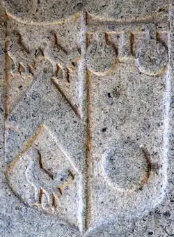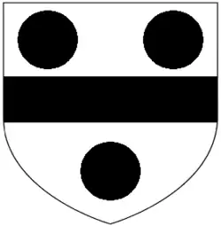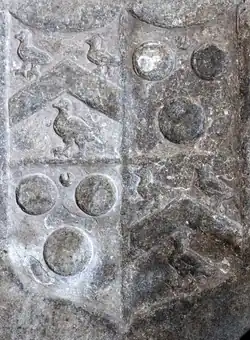 - ^ The roundels on the label are stated by some sources to be "plates" (with tincture argent (white)) but in others to be "bezants" (with tincture or (gold)). These are the ancient arms of the Courtenay Earls of Devon differenced by a label which itself is further differenced by charges