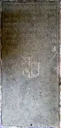 The ledger stone (across the middle of which now stands the 1926 wooden chancel screen) of James Courtenay (d.1592) "The Younger" survives in the Upcott Chapel, St Matthew's Church, the most ancient stone in the church,[26] inscribed in Gothic script as follows: