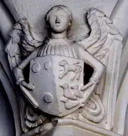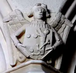Two stone sculpted angels holding heraldic escutcheons survive above the capitals of the arcade separating the Upcott Chapel from the chancel of St Matthew's Church. One shows Courtenay (Or, three torteaux) impaling: a lion rampant coward (with tail between its legs) and the other Courtenay (Or, three torteaux) impaling per fess in chief: A lion passant coward (with tail between its legs) and in base: three birds.
