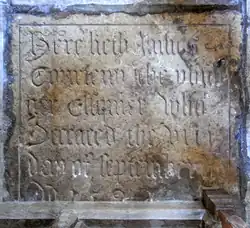 - "Here lieth James Courteny The Younger Estquier who deceased the viii day of September A(nn)o D(o)m. 1592".
