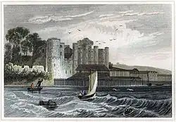 A pair of towers stand on the river's edge a short distance on either side from the main building. They were originally two-storeyed open-backed structures with gun platforms situated on their first floors, providing flanking fire down the line of the ditch around the castle's perimeter. They were later adapted for use as accommodation, with their backs closed with bricks and the towers increased in height to provide a third storey. Traces of the gun embrasures can still be seen at the point where the original roofline was.[24] The South Tower was said to have been for the use of the castle's governor, though their lack of comfort meant that successive governors declined to live there. The two towers are linked to the main building by a crenellated curtain wall where additional cannon were emplaced in two embrasures on the north parapet and one on the south.[25]