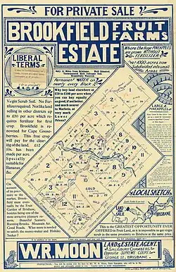 In 1914 there was a sale of 23 fruit farm blocks of land in the vicinity of Upper Brookfield Road and its junctions with Kittani Street and Pacey Road (near the Upper Brookfield State School, 27°28′42″S 152°52′11″E / 27.4782°S 152.8696°E). It was called the Brookfield Fruit Farms Estate and was marketed by W.R. Moon. The land was described as "virgin scrub" suitable for growing bananas, pineapples and vegetables.[6][7][8]
