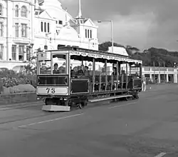 There were fifteen trams on the system.[6] Tram 72/73 is now based at the Jurby Transport Museum. After closure it is believed that a number of cars (including those which remain) were offered for sale and other uses, therefore the scrapping date is largely conjectural. The colour scheme is believed to have been that carried by the restored 72/73 today, being Prussian Blue panelling with cream panelling, lemon yellow detailing and brown/chocolate lettering; this distinctively included all major destinations of the route along the upper valence which has been accurately reproduced on the displayed car today. The three lowest numbered cars were later additions, the fleet numbering commenced at 70 upon opening to allow for possible expansion of the Douglas Bay Horse Tramway fleet which never occurred (the highest number horse car was in reality 50), later cars were allocated unused numbers thereafter.