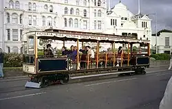 After the closure of the line, two of the cars, No.72 and No.73 were turned into a bungalow at Crawyn, Jurby. Both vehicles retained their bogies.[7] and were parked side by side to create the floorspace, a brick built chimney installed between then. They had been built by G. F. Milnes in 1896. In late July 1968, these two vehicles were rescued by the Douglas Cable Car Group, and a restoration was carried out between then and 1976, at York Road depot (former storage shed for the tramway, later used for buses and horse tram storage), using the best of both cars. The tram now bears the number 72 on one end and 73 on the other, it has been converted to work by battery power and was sometimes seen running on the horse tramway.[2] It was later moved to the Jurby Transport Museum where it remains today on an isolated section of reproduction track together with smaller items from the system also on display.