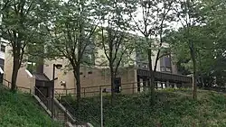 The upper campus residence halls at the University of Pittsburgh include Sutherland Hall, Panther Hall, K. Leroy Irvis Hall, the fraternity housing complex, and the Darragh Street Apartments. Among the newest residence facilities at the university, these buildings reside on the upper campus located near many of the school's athletic facilities. The upper campus resides approximately 200 feet (61 m) above the lower campus that lies along Forbes and Fifth Avenues, providing dramatic views along the hilltop and slopes.[1] Planning for upper campus student housing originated in the late 1960s and early 1970s, but stalled due to community and political opposition until the early 1990s with the opening of Sutherland Hall, the first major student residence constructed by Pitt in 29 years.[2][3]