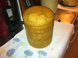 It is cut into four vertical pieces which are cut crosswise into quarter-circle slices.[3] The bread is typically served with cured herring, lard or onion. It is commonly served at Christmastime.[4][3] The bread keeps well.[3]