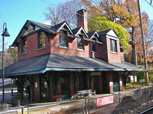 The former station house, which was originally built by the Pennsylvania Railroad, was a café and restaurant in the 2010s.[3] The station is 9.1 track miles from Suburban Station. In 2017 it saw 356 boardings and 305 alightings on an average weekday.