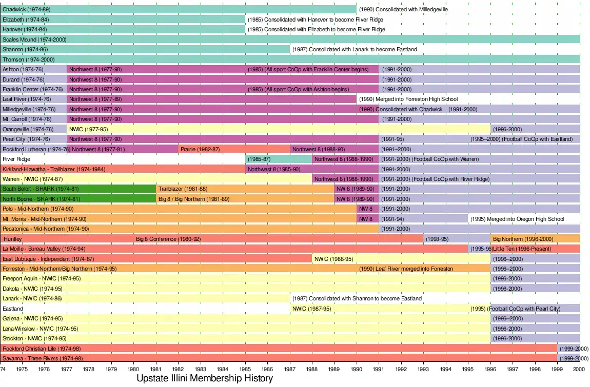 In 1994, Mt. Morris was merged into the Oregon School District and dropped out of the conference. In that same year, Huntley joined and the divisions were realigned into East - Durand, Huntley, Kirkland-Hiawatha, North Boone, Rockford Lutheran and South Beloit and West - Ashton-Franklin Center, Milledgeville, Mt Carroll, Pearl City, Polo, River Ridge and Warren. In 1991, Pecatonica joined the league for all sports except football, due to existing schedules in the Mid-Northern, however, in 1992 joined the East Division. In 1995 Huntley dropped out and East Dubuque, Forreston and La Moille were added to the West Division while Ashton-Franklin Center moved from the West division to the East. In 1996 the Northwestern Illinois Conference (NWIC) and Upstate Illini merged under the Upstate Illini banner. Based on these new additions, three divisions were formed West - Dakota, East Dubuque, Galena, Lena-Winslow, Orangeville, River Ridge, Stockton and Warren. East - Ashton-Franklin Center, Durand, Kirkland-Hiawatha, North Boone, Pecatonica, Rockford Lutheran and South Beloit. South - Forreston, Freeport Aquin, Lanark (Eastland), Milledgeville, Mt. Carroll, Pearl City and Polo. In 1999 Savanna was added to the South Division and Rockford Christian Life to the East Division making the total number of teams 24 for football, 26 overall, the largest conference in Illinois outside of the Chicago Public League. The year 2000 was the last year under the Upstate Illini name because six schools (Ashton-Franklin Center, Durand, Kirkland-Hiawatha, North Boone, Pecatonica and South Beloit) left in 2001 to form the Four Rivers Conference. Rockford Lutheran and Rockford Christian Life also departed the conference in 2001, seeking competition more suited to their locations and size by joining the Private School League. The remaining schools realigned under the Northwest Upstate Illini Conference banner.