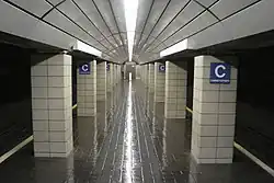 The first PATH stop in New York is at the Christopher Street station; service continues uptown to the 33rd Street terminal, making intermediate stops at Ninth Street, 14th Street, and 23rd Street.[5] Two stations formerly existed at 19th Street and 28th Street. The ornately designed stations in Manhattan featured straight platforms, each 370 feet (110 m) long and able to accommodate 8-car consists.[6] The stations underneath Sixth Avenue (14th, 19th, 23rd, and 28th streets, and the original 33rd Street Terminal) contain round columns with scrolls and the station name near the ceilings. The exposed steel rings of the tunnel's structure can be seen at Christopher and Ninth streets.[7]
