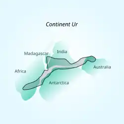 Important geological similarities link now remote Archaean cratons in India (Singhbhum and Dharwar), western Australia (Kilbaran and Pilbara), and southern Africa (Kaapvaal and Zimbabwe) which indicate that these protolithic shields were close together in the mid-Archaean. The name "Ur", from the German prefix ur- meaning "original", was introduced by Rogers 1993, since it is the first continent in his tectonic reconstructions.[6] Other Archaean continental assemblages are considerably younger: Arctica (Baltica, Laurentia, Ur, and Siberia) consolidated around 2.6 Ga, Atlantica (West Africa and eastern South America) consolidated around 2.1 Ga. In some reconstructions the shields of Ur stayed near each other until the Mesozoic break-up of Gondwana.[7]