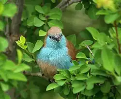 The blue waxbill (Uraeginthus angolensis), also called southern blue waxbill, blue-breasted waxbill, southern cordon-bleu, blue-cheeked cordon-bleu, blue-breasted cordon-bleu and Angola cordon-bleu, is a common species of estrildid finch found in Southern Africa. It is also relatively commonly kept as an aviary bird.[2]