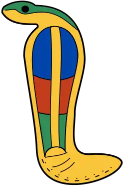 The Uraeus is a symbol for the goddess Wadjet.[2] She was one of the earliest Egyptian deities and was often depicted as a cobra, as she is the serpent goddess. The center of her cult was in Per-Wadjet, later called Buto by the Greeks.[3] She became the patroness of the Nile Delta and the protector of all of Lower Egypt.[4] The pharaohs wore the uraeus as a head ornament: either with the body of Wadjet atop the head, or as a crown encircling the head; this indicated Wadjet's protection and reinforced the pharaoh's claim over the land. In whatever manner that the Uraeus was displayed upon the pharaoh's head, it was, in effect, part of the pharaoh's crown. The pharaoh was recognized only by wearing the Uraeus, which conveyed legitimacy to the ruler. There is evidence for this tradition even in the Old Kingdom during the third millennium BCE.[5] Several goddesses associated with or being considered aspects of Wadjet are depicted wearing the uraeus as well.