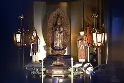 Basil Hall Chamberlain (1880) indicated the presence of a temple dedicated to Urashima at Kanagawa-ku, Yokohama, which housed several relics such as Urashima's fishing-line, and the casket (tamatebako).[96] But when Ernest Satow went there with Chamberlain on 2 May 1880, there was nothing left to see except the statue of Kannon (Kanzeon), the bodhisattva of mercy.[99]