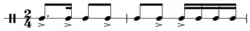 . The traditional instrumentation for a conjunto típico (traditional band), the usual performing group of folk merengue, is a diatonic accordion, a two–sided drum, called a tambora, held on the lap, and a güira. A güira is a percussion instrument that sounds like a maraca. It is a sheet of metal with small bumps on it (created with hammer and nail), shaped into a cylinder, and played with a stiff brush. The güira is brushed steadily on the downbeat with an "and-a" thrown in at certain points, or played in more complex patterns that generally mark the time. Caballito rhythm, or a quarter and two eighths, is also common. The double-headed drum is played on one side with a stick syncopation and on the other side with the palm of the hand.