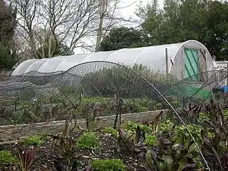 Crops are grown in flowerpots,[14] growbags, small gardens or larger fields, using traditional or high-tech and innovative practices. Some new techniques that have been adapted to the urban situation and tackle the main city restrictions are also documented. These include horticultural production on built-up land using various types of substrates (e.g. roof top, organic production and hydroponic/aeroponic production). The adaptation of vertical farming methods like the use of trellises or tomato cages are popular options for urban horticulture.[15] Because of this, it is also known as roof-top vegetable gardening/horticulture and container vegetable gardening/horticulture.