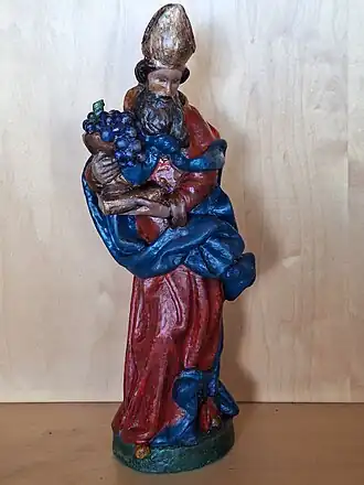 | Attributes | bishop with a bunch of grapes or a vine at his side; a book with a wine vessel on it; grapes on a missal as he holds the triple cross[1] |