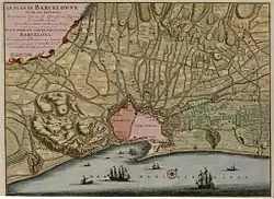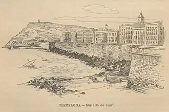 The arrival of the Bourbons generated a series of military engineering works, such as the castle of Montjuïc and the fortress of the Citadel.[65] For the construction of the Citadel (1715-1751), 1200 houses in the Ribera neighborhood were demolished, leaving 4500 people homeless and without compensation, and the Rec Comtal was diverted.[66] The work of Jorge Próspero de Verboom, it was a pentagonal walled bastion, with a protective moat and an esplanade of 120 m between the walls and the surrounding buildings. Demolished in the Revolution of 1868, on its perimeter was installed the park of the Citadel.[67]