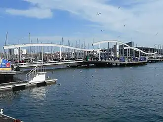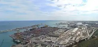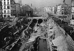 In the middle of the century, the Diputation of Barcelona took charge of establishing new road layouts in the Barcelona plain: the Sarrià road (now Sarrià Avenue), designed by Ildefons Cerdà and built between 1850 and 1853; the road from Sants to Les Corts (1865-1867); and the road from Sagrera to Horta (1871), now Garcilaso Street.[57] In these years, the port, increasingly important as a source of raw materials —especially cotton and coal—, was improved with the construction of a new wharf and the dredging of the port by the engineer José Rafo, who presented his project in 1859.[92]