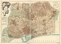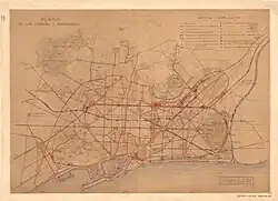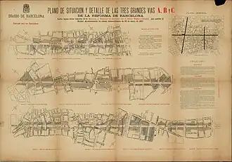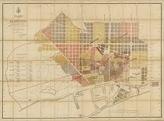 During this century, the municipal ordinances that began with the Edicto de obrería (Workmen's Edict) were consolidated: in 1814, the Pregón de policía urbana (Proclamation of Urban Police) established in 84 articles all the provisions on civil building, maintenance of public spaces and various regulations on security and public order. In 1839, the Bando general de buen gobierno (General Good Governance Charter) renewed and expanded these provisions and, among other things, regulated the relationship between the width of streets and the height of buildings. On the other hand, the law of 8 January 1845 established the City Council's own attributions in various aspects such as urban planning, regulating the sanitary conditions of public spaces, as well as the conditioning of streets, squares and markets.[80] In 1856 the first Ordenanzas Municipales (Municipal Ordinances) were approved, which brought together and expanded previous provisions, within an urban code that contemplated for the first time all aspects of civic and institutional relations in the city. For the first time, building permits were required to include an interior layout plan. These ordinances soon became obsolete due to the new Eixample plan, until in 1891 new ones were drawn up that took into account the new specificities of the expansion and new links in the city. Among other things, the area of occupation of the plots was increased from 50% —established in the Cerdà Plan of 1859— to 70%.[81]