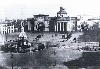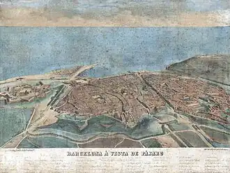 Among the main urban planning actions of these years were the opening of Calle de Fernando (Ferran) in 1827, between La Rambla and the Plaza de San Jaime (Sant Jaume), with a later continuation towards the Borne with the streets of Jaime I (Jaume I) (1849–53) and Princesa (1853).[82] In 1833 the expansion of the Pla de Palau began, which was then the nerve center of the city, with the presence of the Royal Palace, the Llotja and the Aduana. The square was enlarged and the Portal de Mar was built (1844-1848), a monumental gateway to Barceloneta from the old quarter, the work of Josep Massanès, which was demolished in 1859 along with the city walls.[83] Massanès was also the author of a widening plan in 1838 that was never completed, which included the triangle between Canaletes, Plaça de la Universitat and Plaça Urquinaona, and which already sketched what would become Plaça de Catalunya, located in the center of the triangle.[84]