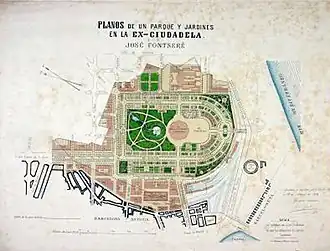 The remodeling project of the Citadel Park was commissioned to Josep Fontserè in 1872, who designed extensive gardens for the recreation of the citizens, and together with the green area he planned a central square and a ring road, as well as a monumental fountain and various ornamental elements, two lakes and a wooded area, as well as various auxiliary buildings and infrastructures, such as the Born market, a water reservoir —currently the library of the Pompeu Fabra University—, a slaughterhouse, an iron bridge over the railroad lines and several service sheds.[112] He also designed the urbanization of the new sector of the Born, composed of a hundred plots of land, which would present a common stylistic stamp, although it was finally only partially realized.[113]