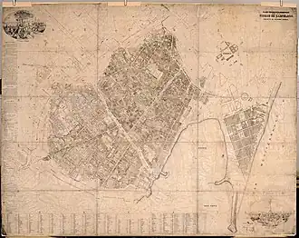 Similarly, the new sanitary provisions enacted at this time led to the disappearance of numerous parish cemeteries, whose plots were developed as new public squares: thus, squares such as Santa Maria, del Pi, Sant Josep Oriol, Sant Felip Neri, Sant Just, Sant Pere and San Jaime (Sant Jaume) came into being.[85] The latter became the political heart of the city, since the Barcelona City Council and the Generalitat de Catalunya were located there.[86] On the other hand, the disappearance of the parish cemeteries led to the creation of a new cemetery located outside the city, the cemetery of the East or Pueblo Nuevo (Poblenou), based on a project of 1773 but which was built mainly between 1813 and 1819. It was followed in 1883 by the Southwest or Montjuic cemetery, while already in the 20th century, the North or Collserola cemetery was built (1969).[87]