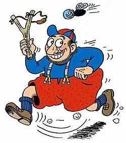 In the series Urbanus is portrayed as an eleven to twelve-year old version of himself, despite his full-grown beard. Just like the real Urbanus he lives in Tollembeek, but here end all similarities. Urbanus is portrayed as a bad young boy who frequently tries to trick the local villagers, his parents, his teacher, his fellow students and gets into trouble for it.[6] The style of comedy is absurd, black and often vulgar. All animals in this comic strip are able to talk. Pop culture references to TV shows, comics, cartoons, films and Urbanus' own merchandise are frequently made. The authors deliberately use Flemish dialect instead of standard Dutch and also deliberately keep the drawing style naïve and simple, inspired by the series of Marc Sleen.