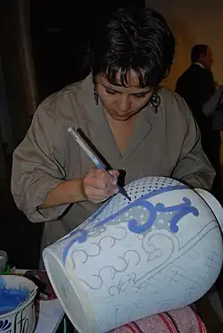 Uriarte is one of the oldest producers of Talavera pottery in Mexico. This is a kind of majolica, named after the city of Talavera de la Reina which had developed in Spain from Arab and Chinese origins and brought to Mexico after the Spanish conquest of the Aztec Empire. While majolica was made in a number of places in Mexico, it became highly refined in the Puebla city area, especially from 1650 to 1750. Talavera work is distinguished by the fine clays found in this area, fired with a tin and lead glaze at high temperatures. This glaze is off white to slightly yellow. The decorations are done only in black, cobalt blue, blue, yellow, green, red and sometimes deep rose, with the design slightly fuzed with the glaze which crazes. Authentic Talavera is still made by the same 16th century methods as in the colonial period and all done by hand.[1][2][3]