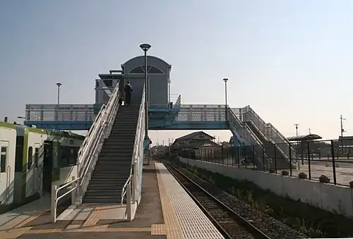 The station consists of a single island platform. The station building is elevated and located on a cantilever pedestrian overpass connecting the platform with the road. The station is staffed.