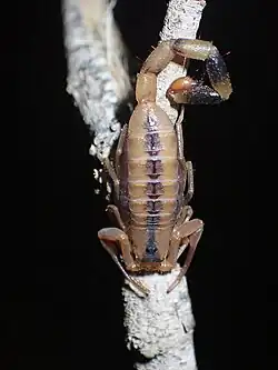 - ^ Schaffrath, Stephan; Prendini, Lorenzo; Predel, Reinhard (March 2018). "Intraspecific venom variation in southern African scorpion species of the genera Parabuthus, Uroplectes and Opistophthalmus (Scorpiones: Buthidae, Scorpionidae)". Toxicon. 144: 83–90. Bibcode:2018Txcn..144...83S. doi:10.1016/j.toxicon.2018.02.004. PMID 29447904.