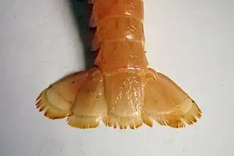 Uropods are typically biramous – comprising an endopod and an exopod. The exopod is typically the larger, and may be divided in two by a transverse suture known as the diaeresis.[2][3] The uropods may work in concert with the telson to form a "tail fan".[4]