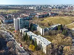 In the 1970s and 1980s, in Ursynów residential neighbourhoods of multifamily residential large panel system buildings began to be constructed. Between 1971 and 1977, the area of North Ursynów was established, with neighbourhoods of Jary, Koński Jar-Nutki, and Stokłosy.[91] In 1977, there was also opened the Roman Kozłowski Park, which included the Cwil Mound, an artificial mound formed from the ground excavated during the building construction.[92][93][94] Between 1976 and 1981, to the south the neighbourhoods of Imielin, Na Skraju, and West Ursynów were built.[95][96] Beginning in 1981, throughout the 1980s, in the central-eastern part of Ursynów, near Komisji Edukacji Narodowej Avenue, was constructed the neighbourhood of Wyżyny.[95][97] Later, beginning in 1987, and continuing throughout the 1990s and 2000s, to the south and east a series of housing estates of multifamily residential buildings were constructed as part of the development of Natolin. It also partially encompassed Kabaty.[98][99] In 1982, Ursynów had a population of around 78,000 people.[100]