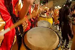 This cultural expression is rooted in the carnivalesque theatre which emprises both religious and civic rituals.[3] In the mid-18th century, Afro-uruguayan enslaved people had one day off to celebrate their own culture and traditions to the rhythm of the drums of Candombe music. In fact, the term "Las Llamadas" (The Calls), which is a traditional carnival dance parade in Montevideo, comes from the call made by the Afro-uruguayan slaves when they wanted to get together in the streets by playing the drums.[4]