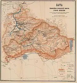 The name Uryankhay is of Mongolian origin, and was the Russian exonym for Tuvans from the 17th century up through the early 20th century. The term was also the Tuvan endonym until the early 19th century, when they began referring to themselves as Tuvans, likely after a subgroup in the region. The protectorate's borders roughly correspond with that of the contemporary Russian Tuvan Republic. Much of Uryankhay Krai's territory was mountainous.[1] The territory was bound by the Tannu-Ola mountains to the south, and the Sayan Mountains to the north.[2]