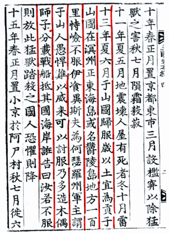Earliest records that appear in the Records of the Three Kingdoms indirectly attest the existence of the kingdom, which says "When Wang Qi (王頎) (of Cao Wei) has come to Okjeo to conquer Kung (Dongcheon of Goguryeo), he asked a local man whether there are people living in the east sea, and the man replied there are people living in an island that exists in the eastern seas, and they select a girl to put in the ocean every July."[4][5]