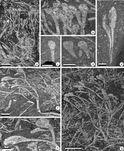 - ^ a b c Shute, C.H. & Edwards, D. (1989), "A new rhyniopsid with novel sporangium organization from the Lower Devonian of Wales", Botanical Journal of the Linnean Society, 100 (2): 111–137, doi:10.1111/j.1095-8339.1989.tb01713.x