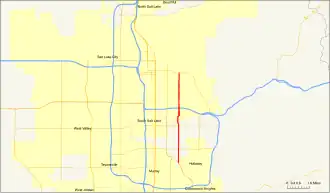 In the early 1990s, traffic planners planned to relieve the congestion that was affecting the two-lane section of the route between 2100 South and 1300 South by implementing a center reversible lane.[3] The reversible lane would have flowed in a northbound direction in the morning and a southbound direction in the evening.[6] There would also be eight overhead signals spaced about a block apart each reminding motorists what direction the lane was flowing in.[3] However, this plan never came to fruition due to local opposition over safety and cost and was canceled at the end of 1993.[7][8][9] On 17 October 2007, the portion of the route in Salt Lake City city limits (north of SR-171) was transferred to the city's ownership. On 7 December of the same year, the remainder of the route was transferred to Salt Lake County's jurisdiction.[10]