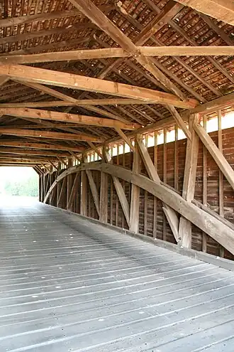 The Utica Road Covered Bridge is a Burr truss wooden covered bridge located near Lewistown, Maryland. Originally built in 1834, it spanned the Monocacy River at the Devilbiss Bridge crossing. An 1889 flood damaged the bridge and the surviving half was moved to Fishing Creek in 1891. Like the nearby Loys Station Covered Bridge, a pier was inserted at the middle of the bridge to halve its span.[2]