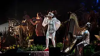 On 15 March 2018, Björk announced a special dress/stage rehearsal of the Utopia tour at the Háskólabío Theater in her hometown of Reykjavik as well as the touring members of her band. Percussionist and Hang player Manu Delago once again traveled with the Icelandic singer, a tradition that began with the 2011 Biophilia tour. He was replaced by Samuli Kosminen in Sweden and Finland.[15] Bergur Þórisson performed on electronics. Katie Buckley played harp in all locations except Barcelona. Tara Lee Minton played harp in Barcelona. A seven-woman flute ensemble, composed of members Melkorka Ólafsdóttir, Áshildur Haraldsdóttir, Berglind María Tómasdóttir, Steinunn Vala Pálsdóttir, Björg Brjánsdóttir, Þuríður Jónsdóttir and Emilía Rós Sigfúsdóttir, rounded out the touring band; this is 5 fewer flutists than what appeared on the studio album, a decision Björk said would allow the listener to focus on the individual sounds each flutist is playing. "These girls are all very different,” she told The Reykjavik Grapevine. “Some of them are into modern music, some are more into French romanticism, others are doing more improv and experimental music, and they’re the best flautists in Iceland!" [16] Arca, who co-produced the studio album and created the beats, electronics and synths, did not tour with her. The dress rehearsal was set for 12 April 2018, over a month ahead of the previously announced first date at All Points East in London. The tour was designed by Heimi Sverrisson and choreographed by Margrét Bjarnadóttir. A second rehearsal date was later added at the same Icelandic venue on 9 April due to the original date selling out, which moved up the premiere of the Utopia tour by three days.[17] While doing press for the opening night of the tour, the flute band's name was revealed: Viibra.[18]