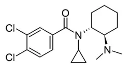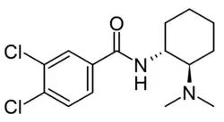 Utopioids (U-type opioids) are a class of synthetic opioid analgesic drugs first developed in the 1970s by the pharmaceutical company Upjohn.[1] However, they were never marketed for medical use. Some compounds from this class have been used for scientific research as model kappa opioid receptor agonists. In the mid-2010s, one mu opioid receptor selective compound from this class, U-47700, re-emerged as a designer drug and became widely sold around the world for several years before being banned in various jurisdictions from 2016 onwards. Following the prohibition of U-47700, a number of related compounds have continued to appear on illicit drug markets. They are often marketed online or included as components in mixtures sold under the guise of "street heroin." U-47700 itself is the most potent mu opioid agonist from this class, with around 7 to 10 times the potency of morphine. Some other compounds such as 3,4-MDO-U-47700 and N-Ethyl-U-47700 retain similar mu selectivity but with lower potency similar to that of morphine, while others have a mixture of mu- and kappa-mediated effects, such as U-48800. Most utopioid derivatives are, however, selective kappa agonists, which may have limited abuse potential as dissociative hallucinogens, but do not alleviate withdrawal distress in opioid dependent individuals or maintain addiction in a typical sense. Nevertheless, this has not stopped them from being sold as designer drugs, and a number of these compounds are now banned in many jurisdictions alongside U-47700 itself.[2][3][4][5][6][7][8][9]
