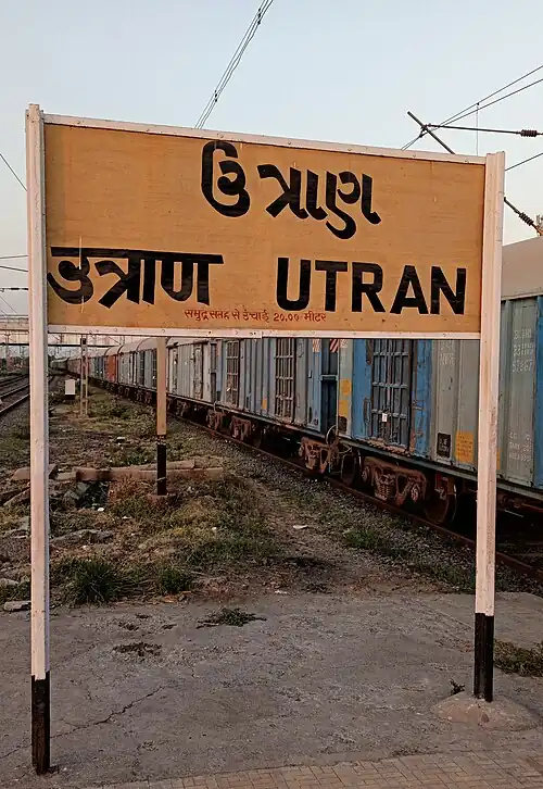 Utran railway station is a small railway station on the Western Railway network in the state of Gujarat, India.[1] It serves Utran town of Surat district. Utran railway station is 3 km (1.9 mi) from Surat railway station. Passenger and MEMU trains halt here.[2][3]